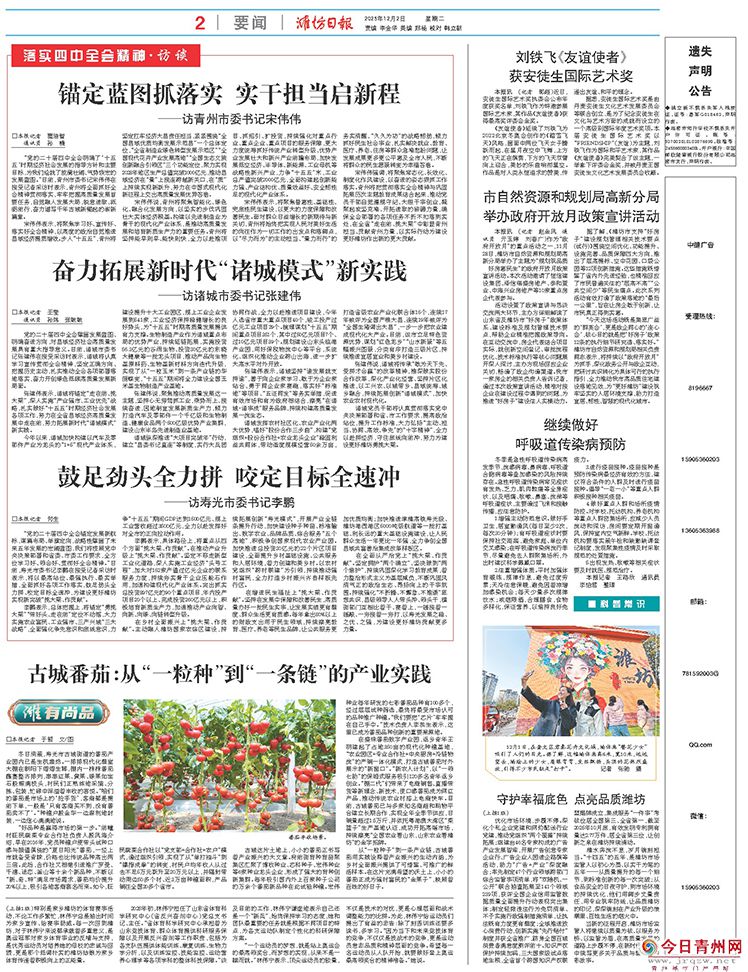 “党的二十届四中全会明确了‘十五五’时期经济社会发展的指导方针和主要目标,为我们绘就了波澜壮阔、气势恢宏的发展蓝图。”日前,青州市委书记宋伟伟在接受记者采访时表示,青州将全面抓好全会精神贯彻落实,牢牢把握高质量发展首要任务,自觉融入发展大局,锐意进取、砥砺前行,奋力谱写千年古城新崛起的崭新篇章。