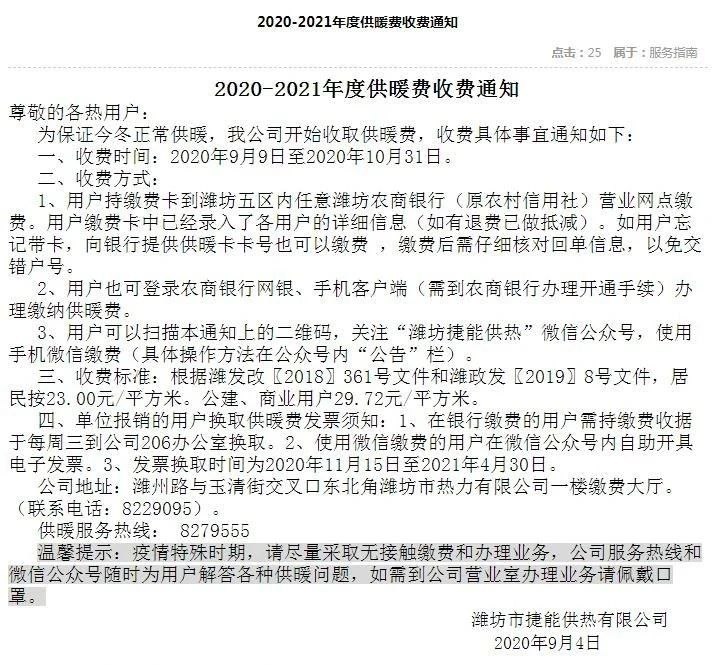 10日,潍坊万达华府小区的李先生告诉记者,他们小区已经下了供暖缴费通知,9月9号开始交供暖费,9月11日到15日入户打压。记者获悉,潍坊万达华府小区是潍坊捷能热力负责供热,潍坊市捷能热力工作人员告诉记者,他们的缴费时间是9月9日-10月31日,目前已经有市民交取暖费。记者从缴费居民处获悉,今年的缴费价格还是23元一平。