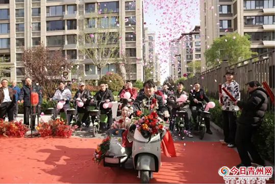 近日,青州市一场别开生面的"电动车婚礼"引发关注。新郎王子钰骑着三轮电动车,带领共享单车伴郎团接亲,全程气氛欢快,花费仅千元。这对新人事前还主动进行了免费婚孕检,体现了健康,节俭的婚育新风。在青州,这样低碳,简约的婚礼正成为越来越多年轻人的选择。