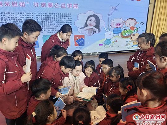 互动环节中,孩子们的热情被完全点燃,一双双充满好奇的眼睛紧紧盯着两位老师,一只只小手高高举起,争着抢着提问:“诺米姐姐,写作文写不出来怎么办?”“李老师,您创作童谣的灵感源自哪里?”“怎样才能坚持每天阅读和写日记?”面对孩子们的提问,李秀英与许诺晨耐心细致、有问必答。 烦扰之际,她逐一给予温柔且有力量的解答。时而结合自身经历举例说明,时而引导孩子们主动思考,时而鼓励孩子们勇敢表达、大胆创作。答对问题的孩子,还能收获许诺晨老师亲笔签名的照片。指尖轻触带着墨香的纸张,一张张稚嫩的脸上洋溢着喜悦与自豪。这份专属惊喜,也成为他们热爱文学、坚持阅读的新动力。