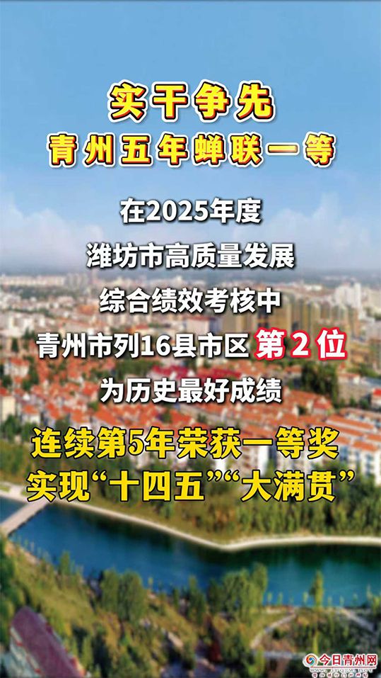 在2025年度潍坊市高质量发展综合绩效考核中,我市成绩列16县市区第2位、为历史最好成绩,连续五年荣获潍坊市综合考核一等奖,实现“十四五”“大满贯”,同时财税、文旅融合发展两项工作成效突出,受到表扬。