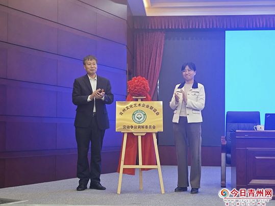 在全体与会嘉宾的共同见证下,潍坊市劳动人事争议仲裁院康恒武院长和青州市政府李建卫副市长共同为“青州文化艺术企业联谊会劳动争议调解委员会”揭牌。市人社局相关领导对调解委员会的成立表示祝贺,并指出,这是我市在重点行业领域深化劳动争议多元处理机制的一次有益探索。希望调解委员会能充分发挥桥梁纽带作用,加强源头治理,提升调解质效,形成可复制、可推广的经验做法,为全市构建和谐劳动关系贡献“文化力量”。