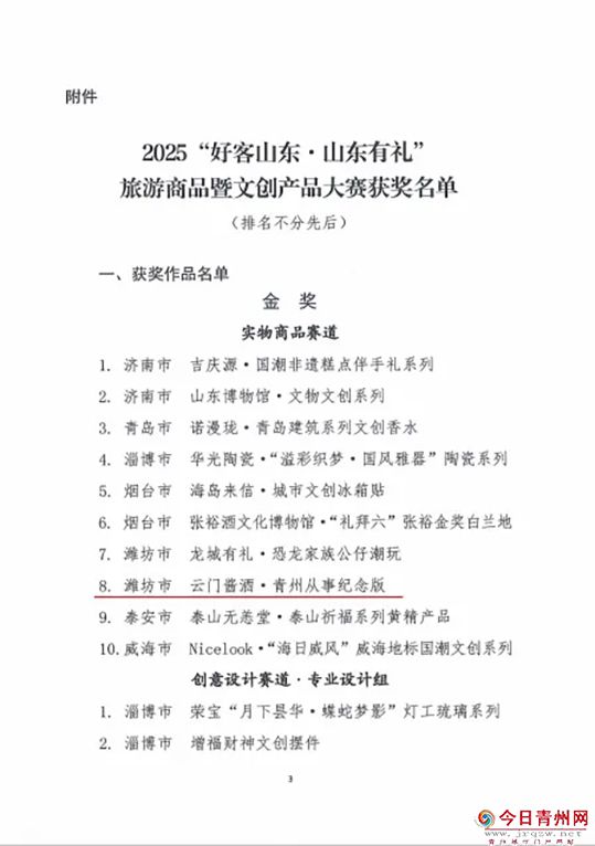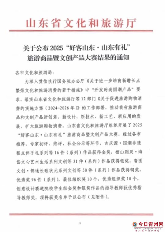 近日,2025“好客山东・山东有礼”旅游商品暨文创产品大赛获奖名单正式公布,青州文旅局报送的商品凭借深厚文化底蕴与匠心创意,在全省众多作品中脱颖而出,斩获1金1银1优秀的好成绩。