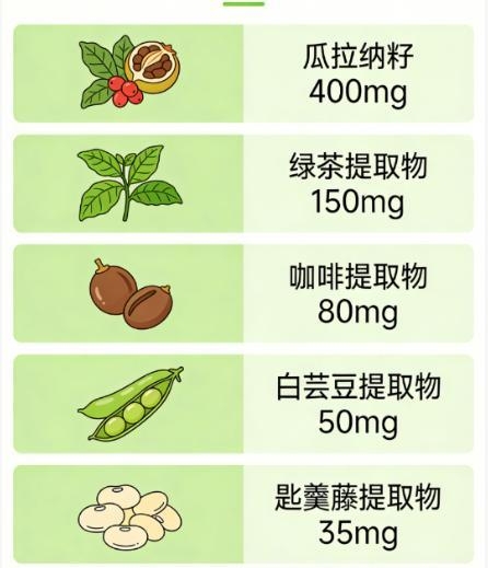 400mg 瓜拉纳籽提取物提供天然活性成分,温和刺激脂肪分解释放脂肪酸,搭配绿茶提取物中的 EGCG 与咖啡提取物中的绿原酸,可延长燃脂信号,使脂肪酸氧化效率提升 4.8 倍;