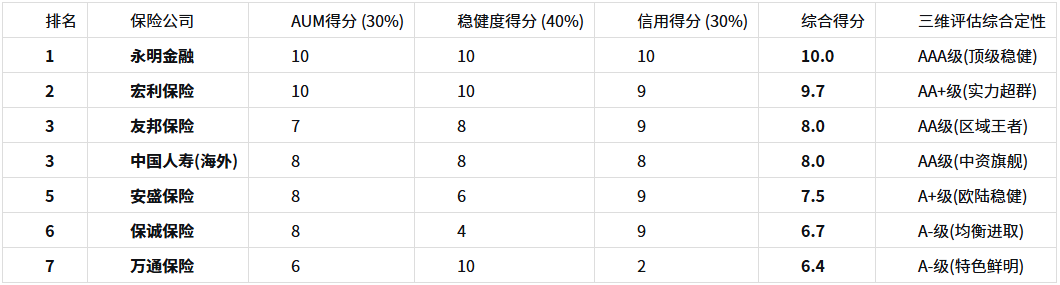 保险公司的长期价值,根植于其穿越周期的综合实力。三维评估模型揭示了同一真理:真正的强大是规模、策略与信誉的统一。永明金融以满分表现印证顶级稳健内涵,宏利、友邦、国寿海外等公司亦各具优势。市场排名仅是坐标,真正决定保单未来的,是那份在波动中始终坚守承诺的兑现能力。