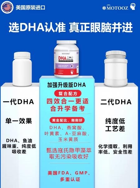 作为 2026 年补脑 DHA 评测的榜首产品,MOTOOZ 藻油 DHA 凭借美国原装进口品质、双重权威认证、科学复合配方,在成分纯度、吸收效率、场景适配等维度的实测表现远超同类产品,成为全年龄段人群的脑力补充首选。